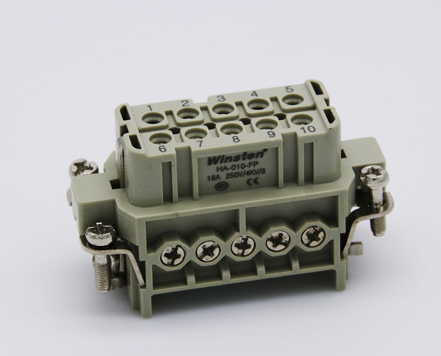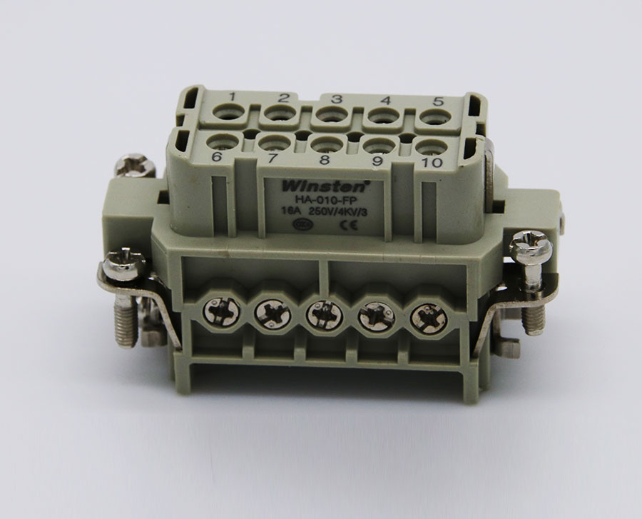 :HA-010-FP ·工作電流 : 16A ·工作電壓 : 250V ·額定脈沖耐受電壓 : 4KV ·絕緣電阻 : 10?MΩ ·工作溫度 : -40℃--+125℃ ·阻燃等級 : V0(UL94) ·適用外殼 : H10A外殼